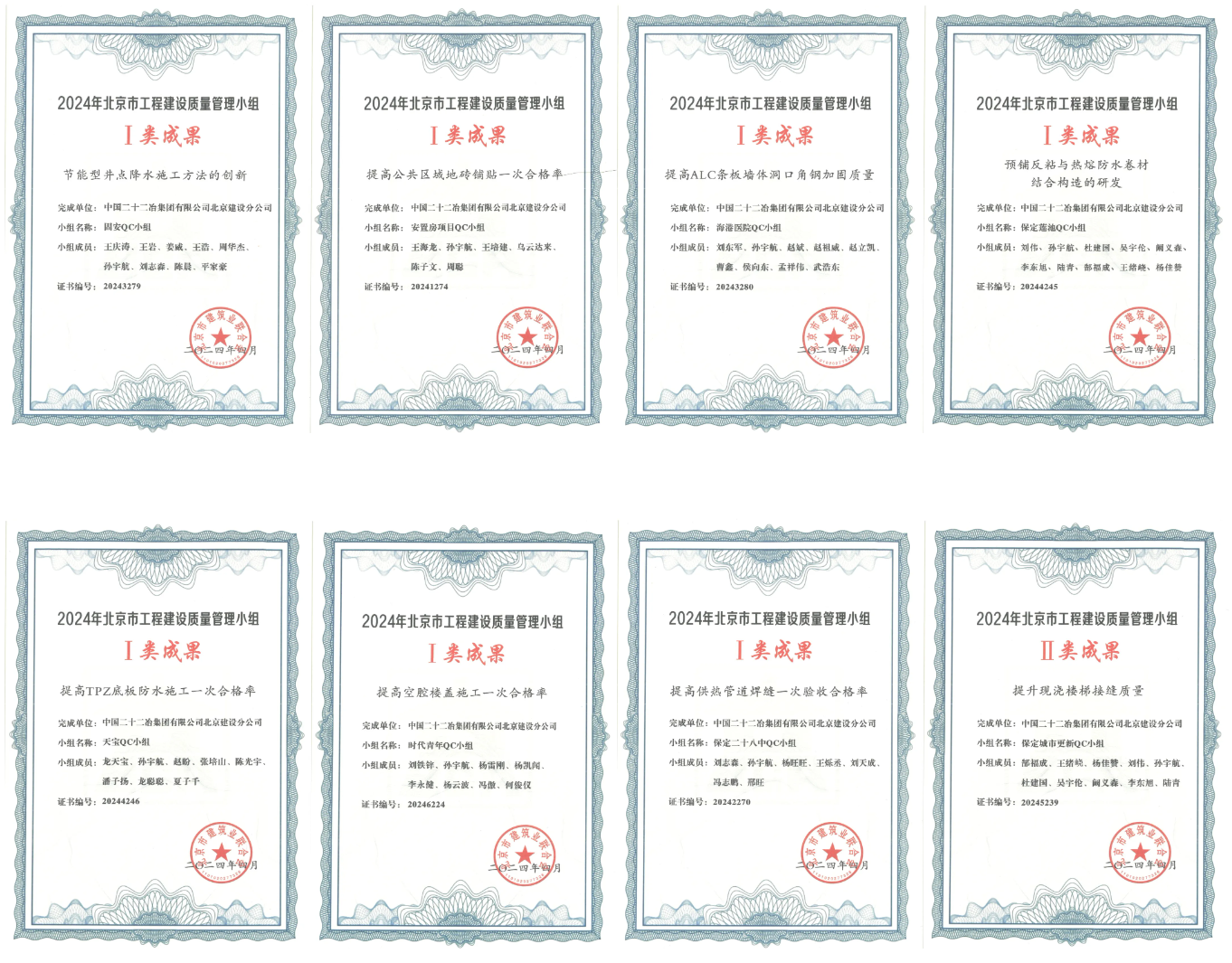 4月17日,在北京市建筑業聯合會組織的2024年度QC競賽活動中,崇建公司8項參賽成果全部入圍,最終獲得省部級一等獎7項,二等獎1項,時隔一年再次刷新了崇建公司在屬地化質量管理活動競賽中的最好成績,其中一等獎獲獎數量超過了以往屬地化競賽活動一類獎項的總和,成果總體水平提升明顯。