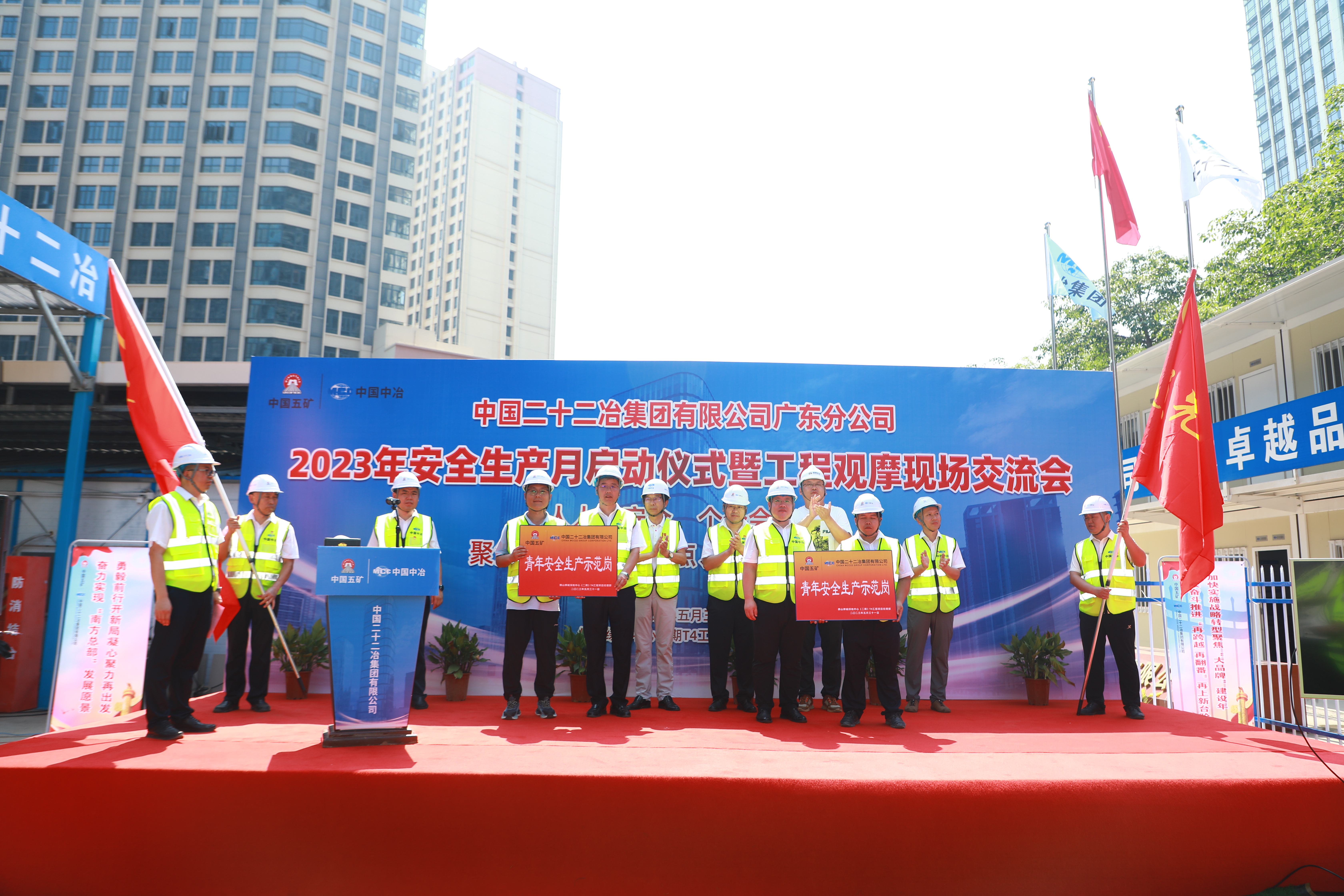 總工程師柯紅、副總經(jīng)濟師(主持工作)李建為項目常務(wù)經(jīng)理、黨支部書記授黨員先鋒隊旗。書記助理、紀委副書記趙清華,總經(jīng)理助理陳圣禹為青年代表授青年安全生產(chǎn)示范崗牌。