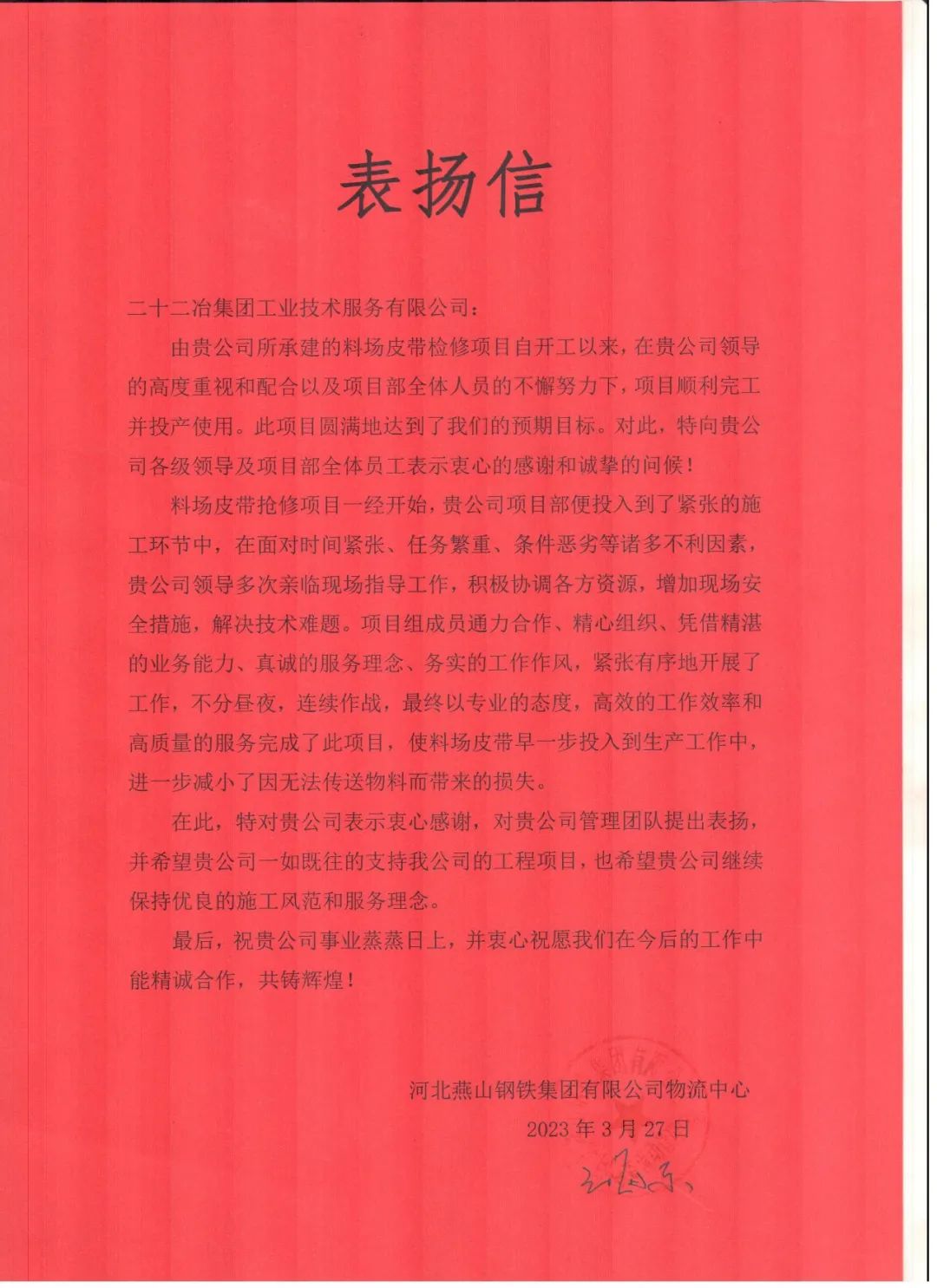 近日,工業技術公司燕鋼項目部在承建的河北燕鋼集團料場皮帶檢修項目、煉鋼二廠1#轉爐爐役及2#連鑄檢修施工中以專業的技術,高效的工作效率和高質量服務順利完成各項檢修任務,得到了甲方業主的高度贊許,并收到來自業主的表揚信。