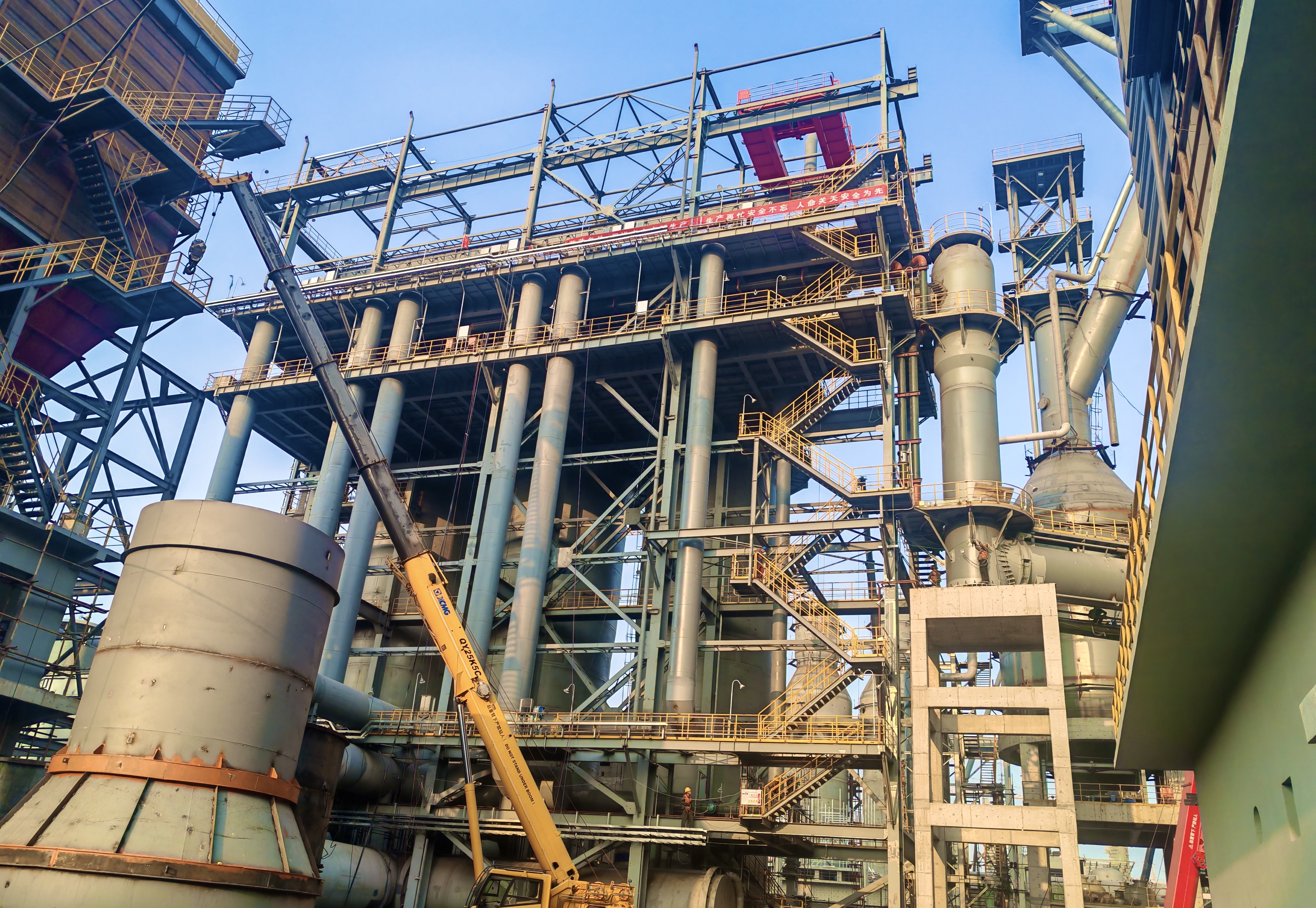 熱風(fēng)爐系統(tǒng)由三座殼體框架及平臺、冷風(fēng)、熱風(fēng)等鋼結(jié)構(gòu)組成,同時涉及電氣安裝、設(shè)備安裝、爐內(nèi)砌筑等施工內(nèi)容,總體高度為46.78米。施工過程中,由于場地狹小,且多專業(yè)同時施工,給工程造成很大困難。針對現(xiàn)場特殊情況,項目團隊組織相關(guān)人員認真討論工序間銜接,科學(xué)合理安排各專業(yè)工序,同時,各專業(yè)管理人員緊盯施工現(xiàn)場,相互協(xié)調(diào)共同解決施工難題。在保證安全質(zhì)量前提下,采取兩班倒作業(yè),順利完成烘爐節(jié)點,得到了甲方的充分贊揚與認可,為下一步施工奠定了堅實基礎(chǔ)。