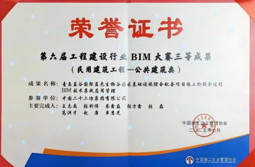 近日,山東公司《青島藍(lán)谷國際藍(lán)色生物谷園區(qū)基礎(chǔ)設(shè)施綜合配套項目施工階段全過程BIM技術(shù)集成應(yīng)用管理》獲評“中施企協(xié)”BIM技術(shù)應(yīng)用大賽三等獎,不僅體現(xiàn)出公司在技術(shù)創(chuàng)新與應(yīng)用實踐中的卓越實力,也充分展示了團隊在推動行業(yè)進步方面的持續(xù)努力與專業(yè)水平。