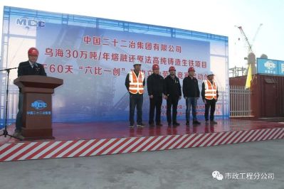 5月1日,市政公司2020年大干60天“六比一創(chuàng)”建功立業(yè)勞動競賽啟動儀式在烏海30萬噸/年熔融還原法高純鑄造生鐵項目部拉開帷幕。賽思普科技有限公司副總經(jīng)理周海川同志,二十二冶集團公司工會綜合管理部業(yè)務(wù)主管常洪文同志,市政公司黨委副書記、紀(jì)委書記、代理工會主席季濤同志,市政公司總會計師盧衛(wèi)兵同志以及烏海項目相關(guān)人員出席此次活動。