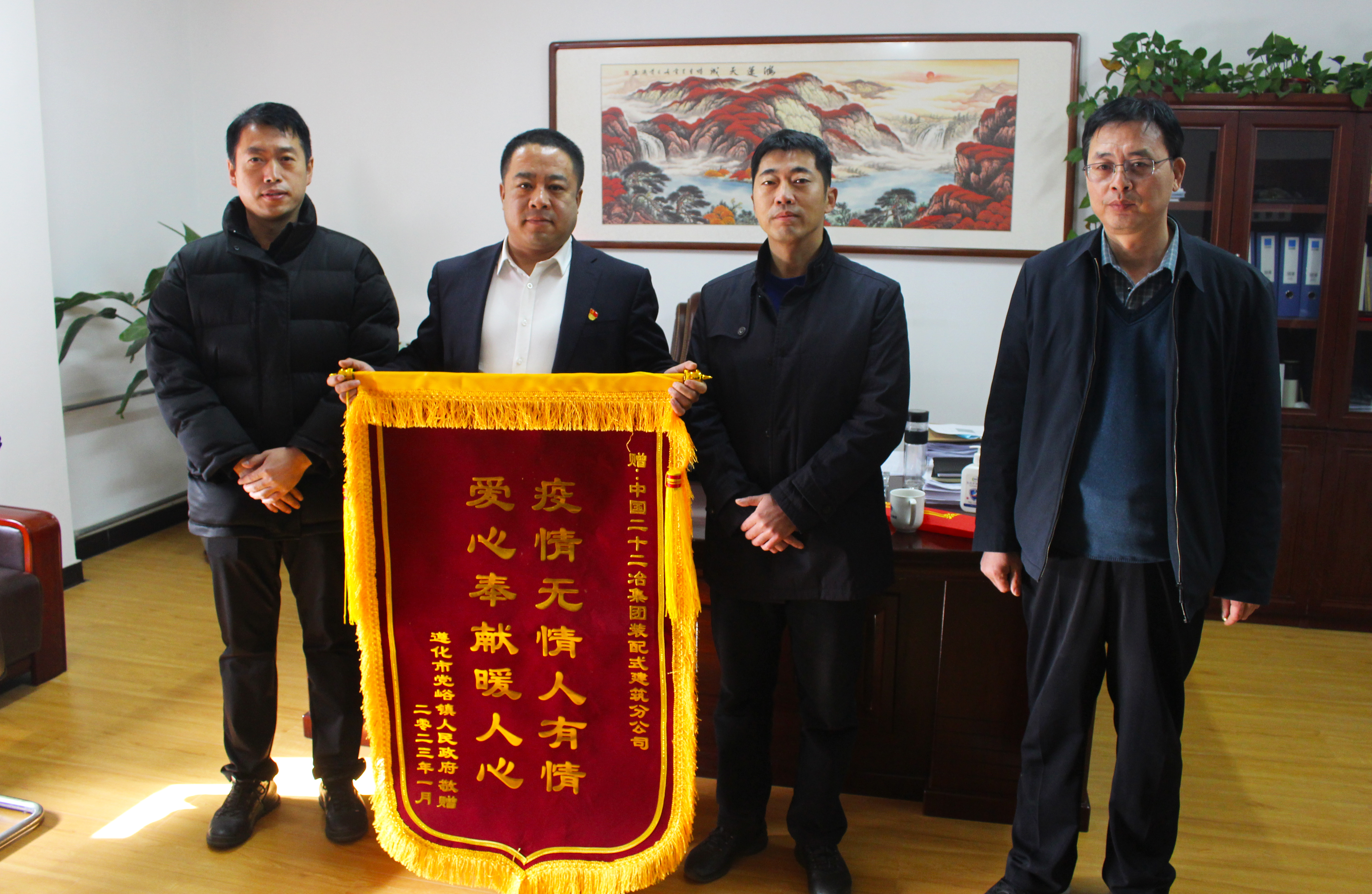 1月18日,遵化市黨峪鎮人民政府代表將一面繡有“愛心奉獻暖人心 疫情無情人有情”的錦旗送至裝配式公司。對公司在疫情期間與駐地政府同舟共濟、共克時艱,積極履行央企社會責任,為疫情防控作出重大貢獻表示了衷心感謝。
